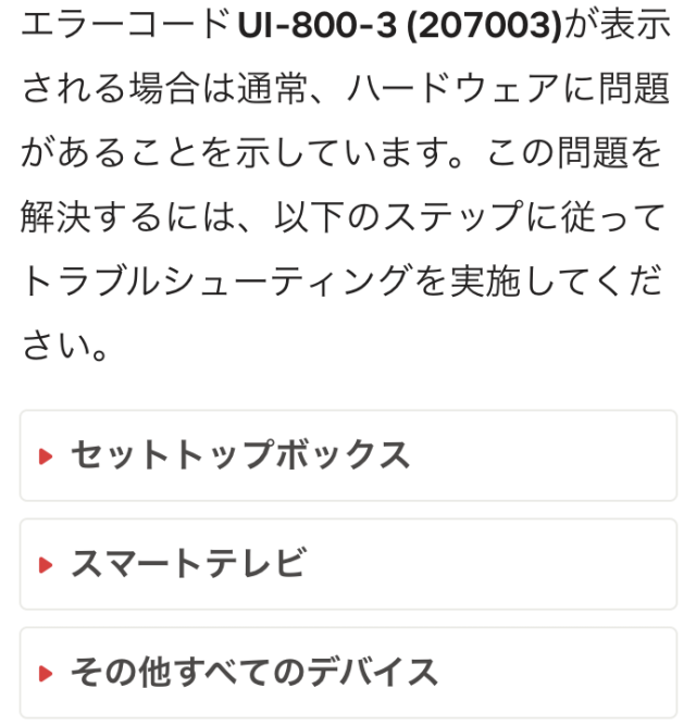 「Netflixエラー UI-800-3(207003)」が表示された内容は以下の通りです。