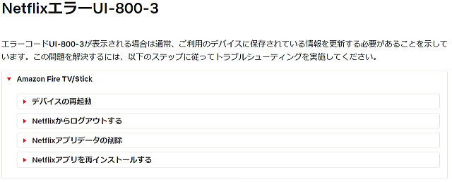 「Netflixエラー UI-800-3(207003)」とはデバイスの問題、僕の場合はFire TV Stick側の問題だっということです。