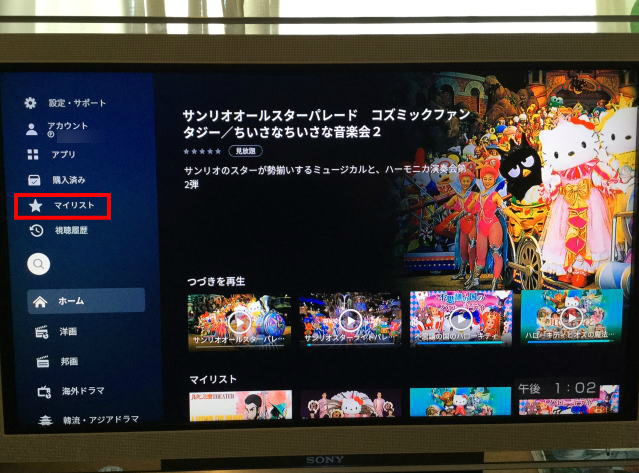 Fire TV StickからU-NEXTに行き管理画面を表示し、左のメニューから「マイリスト」の一覧を表示します。