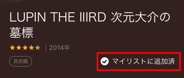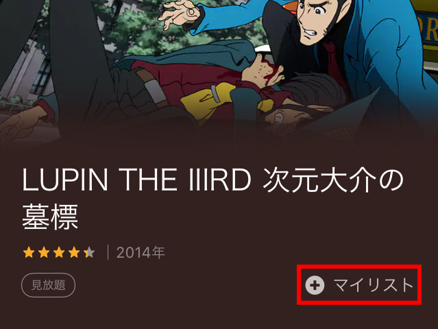 「LUPIN THE 3RD・次元大介の墓標」というアニメを例にとり見ていきます。上の画面のように、詳細画面を出します。タイトル・年・見放題の次に「+マイリスト」というのがあります。